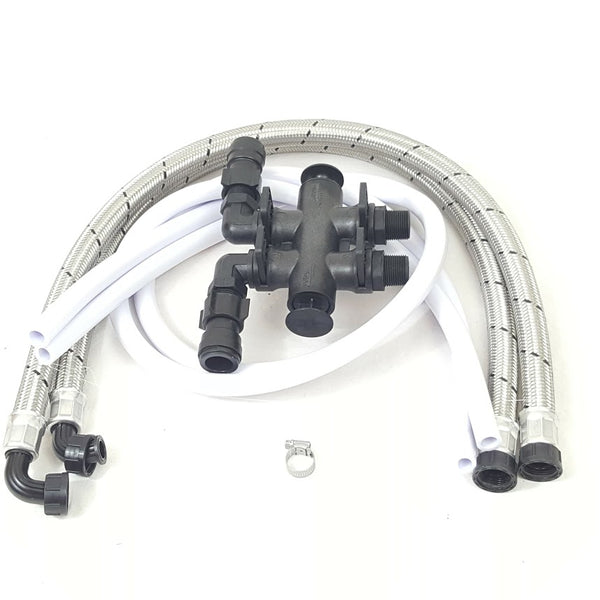 Forget traditional installation kits with 15mm or 22mm hoses T's, inlet valves, outlet valves and bypass valves. We can supply one kit that does everything! Using separate valves to form a bypass can involve up to ten plumbing joints, ours has only two. It is supplied with both 15 and 22mm pushfit connections. To have this supplied with your water softener, choose the Universal installation kit option.